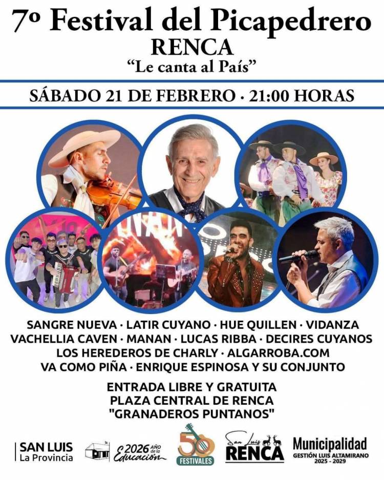 Bajo el lema “Le canta al país”, el encuentro contará con la participación de Sangre Nueva, Latir Cuyano, Hue Quillen, Vidanza, Vachellia Caven, Lucas Ribba, Decires Cuyanos, Los Herederos de Charly, Algarroba.com, Va Como Piña y Enrique Espinosa y su conjunto.