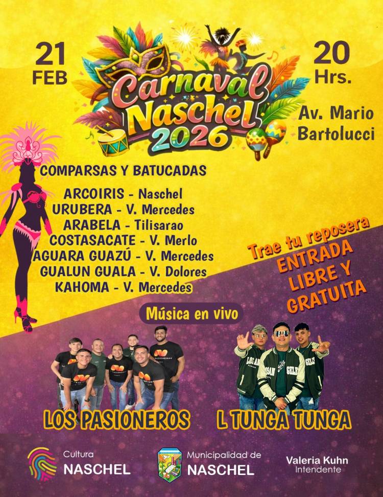 Naschel celebrará el sábado 21 desde las 20:00 en avenida Bartolucci, con comparsas y batucadas de distintas localidades y shows en vivo de Los Pasioneros y L Tunga Tunga. La entrada es libre y gratuita.