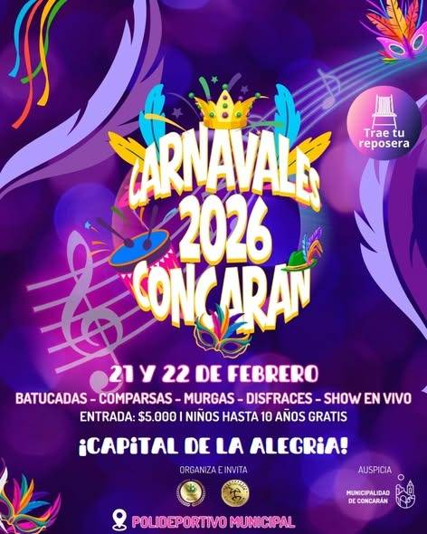 En Concarán, “Capital de la Alegría”, habrá dos jornadas (sábado 21 y domingo 22) en el Polideportivo Municipal. La entrada general es de $5.000 y gratuita hasta los 10 años.
