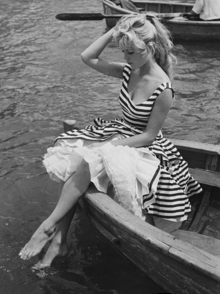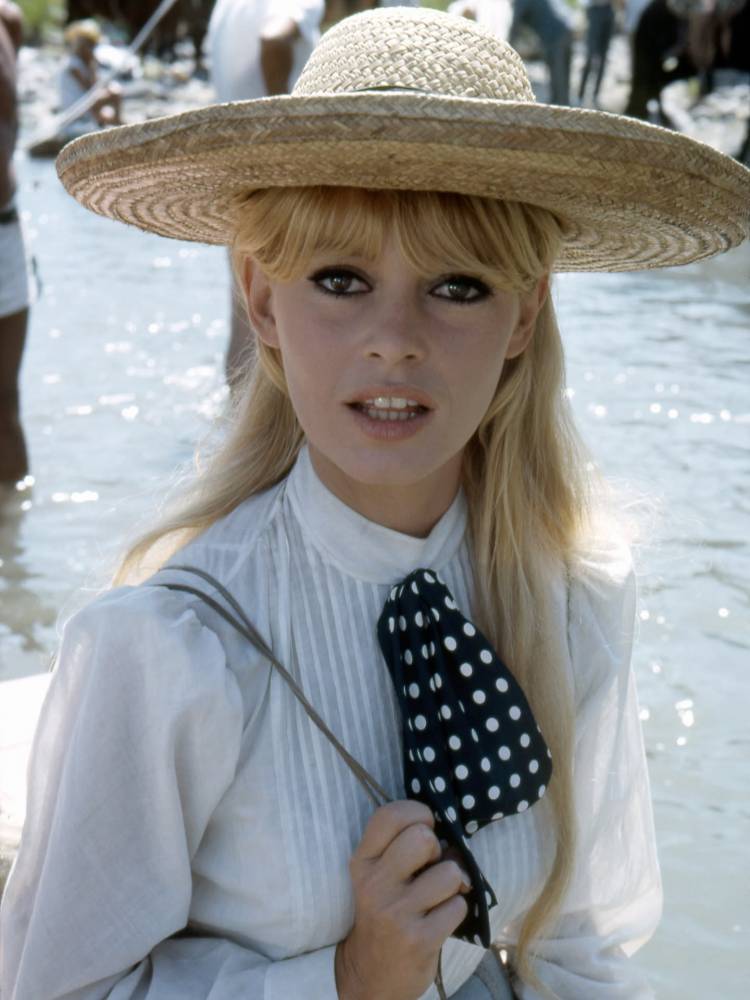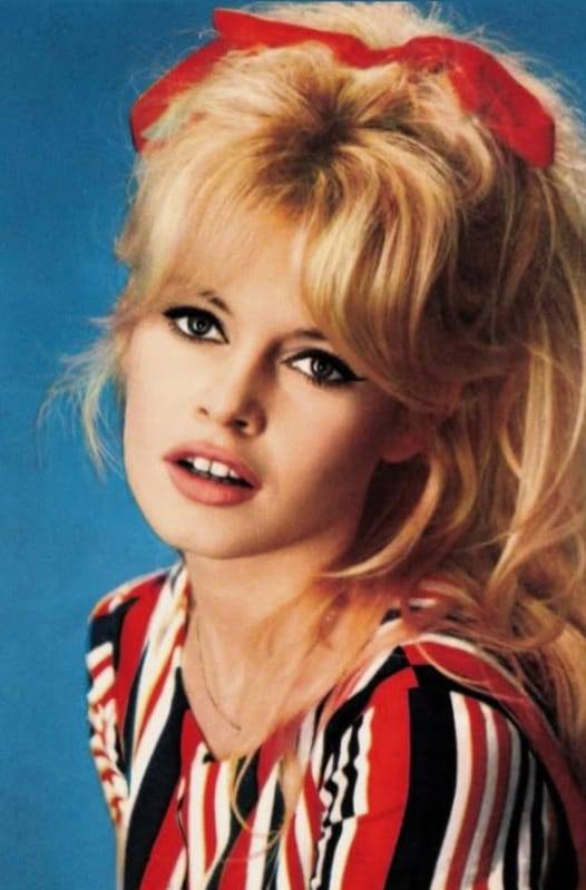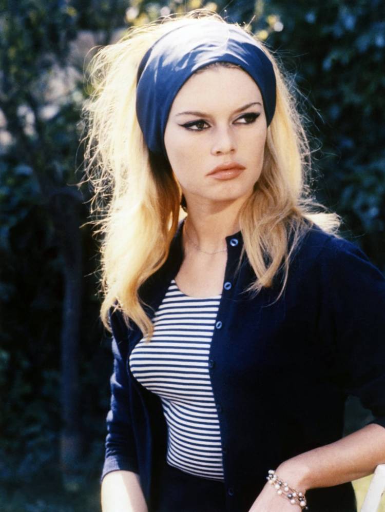 Sus peinados altos y recogidos, con ondas suaves y aire romántico, solían acompañarse de moños, lazos, diademas anchas o pañuelos. Los anteojos de sol extragrandes y los canastos de mimbre completaban un estilismo aparentemente simple, pero profundamente sofisticado. Bardot también impuso los tops y blusas románticas con lazos de inspiración victoriana, los suéteres a rayas estilo navy y un maquillaje icónico: delineado grueso en el centro y fino en los extremos para intensificar la mirada con misterio y dramatismo.