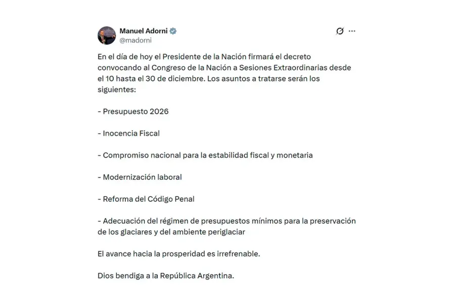 El jefe de Gabinete, Manuel Adorni, confirmó que el presidente Javier Milei firmará este viernes el decreto que convocará al Congreso a sesionar en extraordinarias entre el 10 y el 31 de diciembre. El Gobierno enviará un paquete de proyectos considerado clave para su programa económico, institucional y penal.
