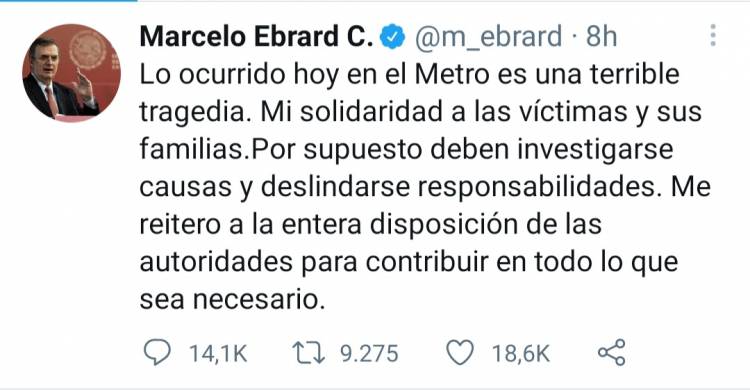 Por su parte, el canciller Marcelo Ebrard, quien fuera jefe de Gobierno de la Ciudad de México (2006-2012) y quien emprendió la construcción de la Línea 12 del Metro, expresó: "Es el más terrible accidente que hayamos tenido en el Sistema de Transporte Colectivo, y lo primero que hay que hacer es solidarizarse con las víctimas de esto, es un día muy triste para todos".