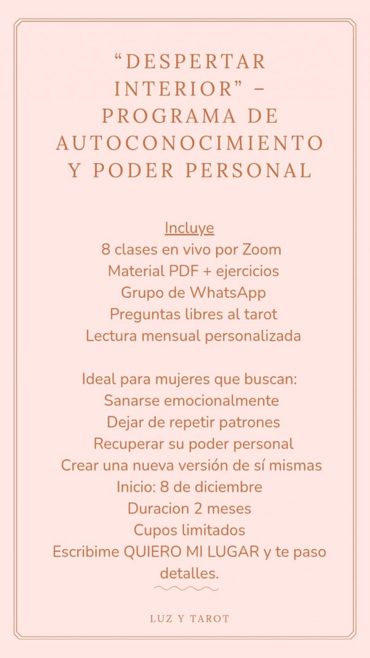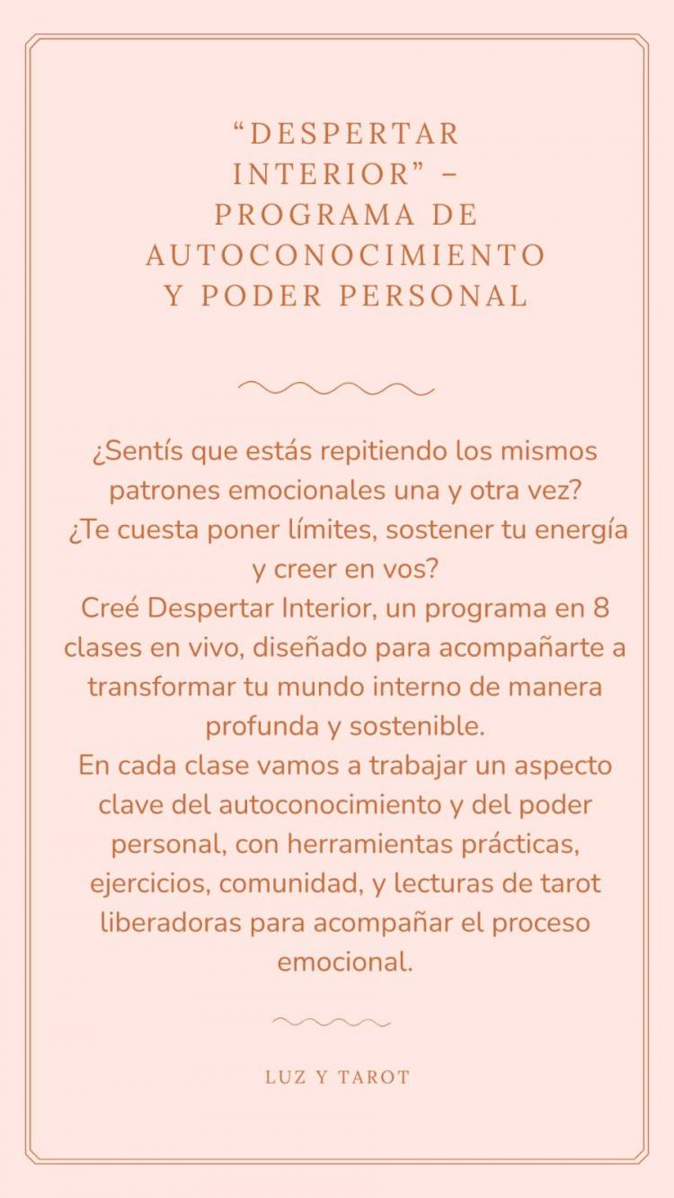 “Despertar Interior” es un programa de ocho encuentros en vivo vía Zoom que busca acompañar a mujeres que atraviesan procesos emocionales repetitivos, dificultades para establecer límites y necesidad de reconectar con su autoestima y su poder personal. La formación integra material teórico-práctico, grupo de acompañamiento, ejercicios de integración y lecturas de tarot terapéutico orientadas a la comprensión emocional profunda.