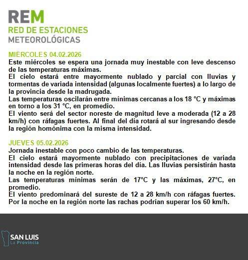 La Red de Estaciones Meteorológicas (REM) informó que la provincia de San Luis atravesará dos jornadas marcadas por la inestabilidad, con abundante nubosidad, lluvias y tormentas de variada intensidad, además de un leve descenso de las temperaturas máximas.