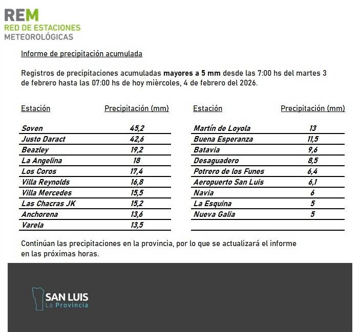 La REM informó que San Luis atravesará días de inestabilidad, con lluvias, tormentas intensas, ráfagas fuertes y leve descenso térmico.