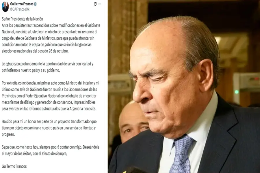 Francos comunicó su renuncia indeclinable mediante una carta pública dirigida al presidente, en la que atribuyó su decisión a los “persistentes trascendidos sobre modificaciones en el Gabinete Nacional”.