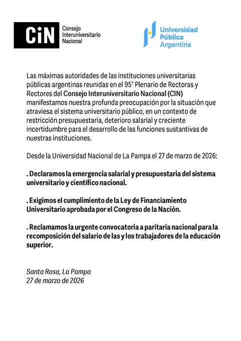 El Consejo Interuniversitario Nacional (CIN) también expresó su preocupación por la situación del sistema universitario y declaró la emergencia salarial y presupuestaria del sector.