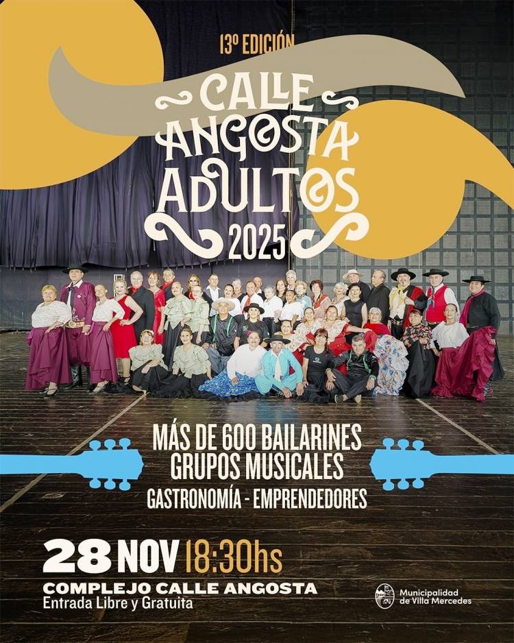 Con folclore, tango y flamenco, más de 600 bailarines brillarán en una nueva edición del festival que celebra la identidad cultural de Villa Mercedes. Los centros de adultos mayores y academias de la ciudad, junto a delegaciones de distintos puntos de San Luis y Córdoba, se presentarán en el emblemático escenario ‘Alfonso y Zabala’, donde el próximo viernes 28 se realizará la 13° edición de ‘Calle Angosta Adultos’.