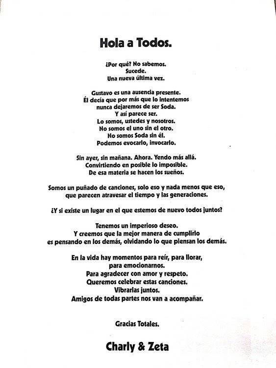 Hace apenas unas horas mediante un manifiesto firmado por ambos Charly Alberti y Héctor “Zeta” Bosio integrantes de la banda que fue liderada por el querido y recordado Gustavo Cerati, confirmaron que el sueño de miles de fanáticos se había hecho realidad y la gira Gracias totales- Soda Stereo estaba en marcha.