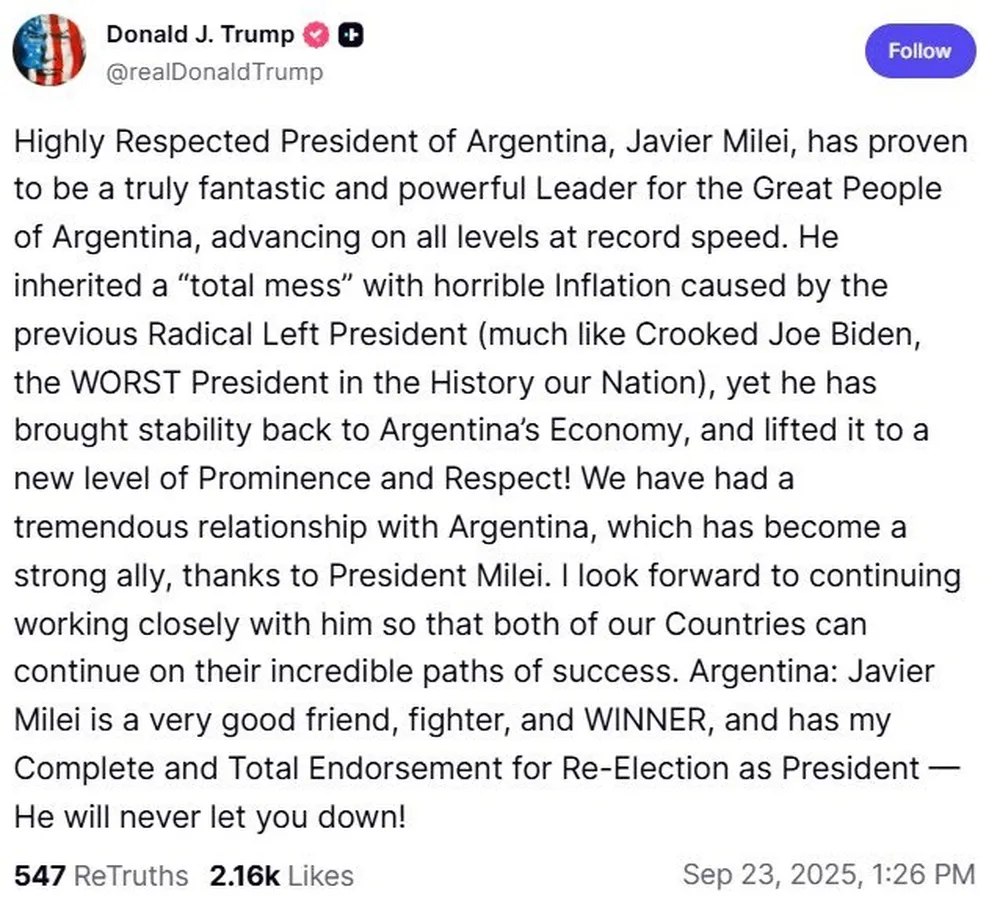 Finalmente, Trump cerró su publicación con un mensaje dirigido a la política argentina:
