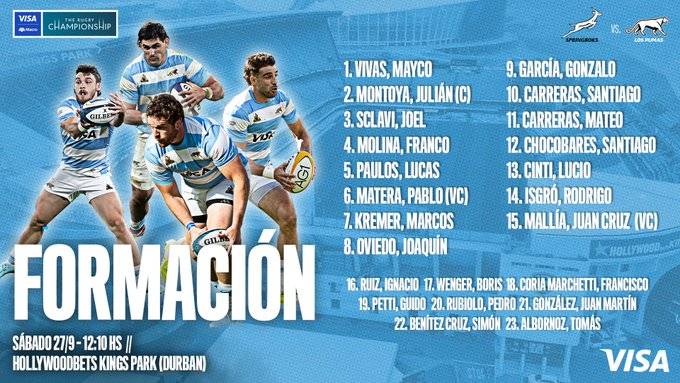 El seleccionado argentino de rugby, dirigido por Felipe Contepomi, enfrentará este sábado a Sudáfrica en el Estadio Kings Park de Durban, en un duelo clave por la quinta fecha del Rugby Championship.