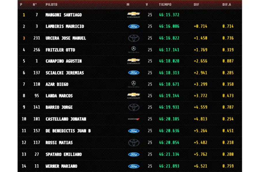 Mangoni tuvo un rendimiento destacado desde el inicio. Venía de abandonar en la fecha anterior en Neuquén, pero logró revertir la situación con un segundo puesto en clasificación —a apenas 0s006 del mejor tiempo— y la serie más rápida del domingo.