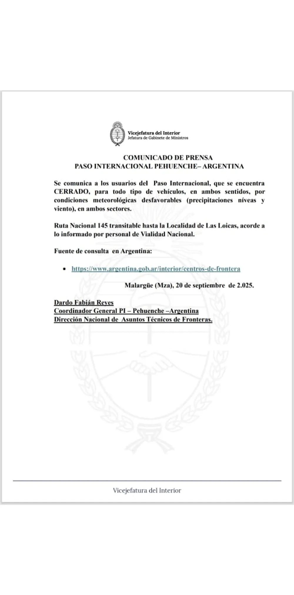 “Se comunica a los usuarios del Paso Internacional, que se encuentra CERRADO, en ambos sentidos para todo tipo de vehículos, por condiciones meteorológicas desfavorables”, indica el comunicado oficial.