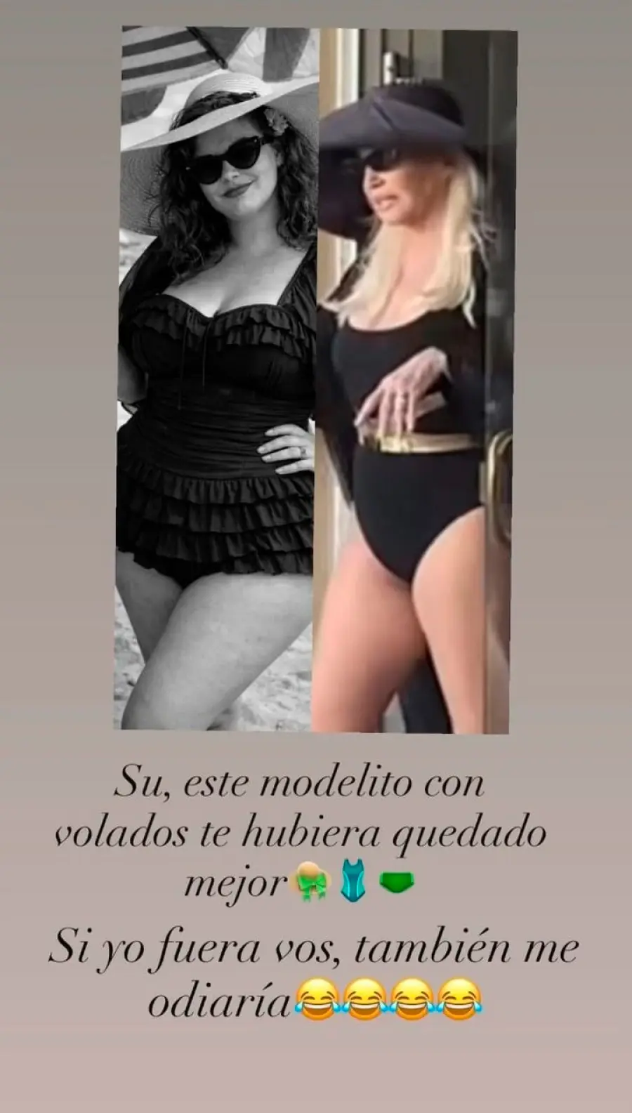 En una de sus publicaciones compartió una captura del video de Susana Giménez en traje de baño y la comparó con la imagen de una modelo plus size que utilizaba una malla con volados y mayor cobertura.